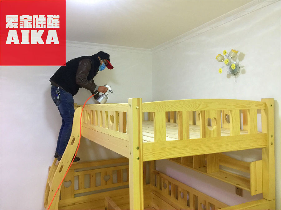 近日,我们爱家除醛为回民街某小区业主除甲醛,她家的污染源主要是木制床以及部分木制家具,尤其是这张上下铺,导致客厅内到处弥漫着一股“木头味”。