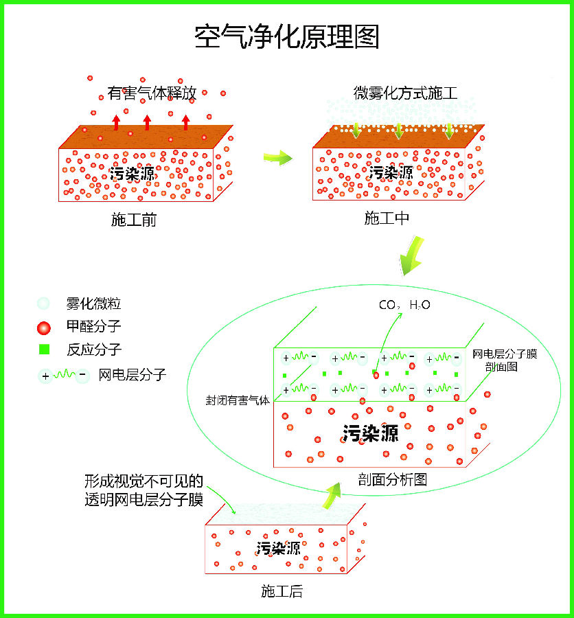 施工后图为了形象的描述分子膜封闭有害气体原理,将分子膜剖面以三层膜示意(第一层和第三层为极性层,中间层为反应层):极性层为净化液在污染物表面交联形成的功能“网电层”分子(大分子聚合物及其高活性表面官能基)组成,网电层分子包拽(物理/极性吸附)游离的甲醛等污染物分子,阻拦大部分污染物分子;中间层为网电层中的反应分子,主要对未被第一层吸附的甲醛分子等聚合或分解成水和二氧化碳等无害碳水化合物;“三重保险”完全阻断甲醛等挥发性有机化合物进入室内环境的机会,达到高效、持久的净化室内空气的目的。